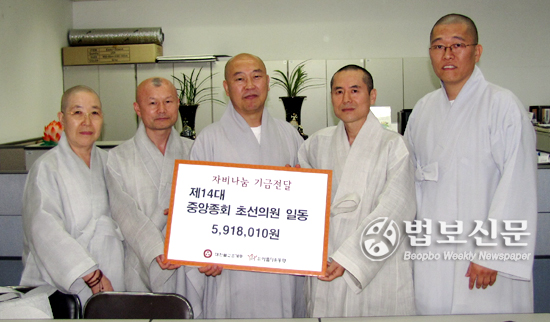 14´ë Áß¾ÓÁ¾È¸ Ãʼ±ÀÇ¿ø ½º´ÔµéÀº 9¿ù 6ÀÏ ¾Æ¸§´Ù¿îµ¿Çà¿¡ ÀÚºñ³ª´®±â±Ý 600¿© ¸¸¿øÀ» Àü´ÞÇß´Ù. ÀÌ ±â±ÝÀº Ãʼ±ÀÇ¿ø ½º´Ô 26¸íÀÌ Áö³ 4³â°£ Á¾´Ü¿¡¼ Áö±ÞµÈ ÀÇÁ¤È°µ¿ºñ µîÀ» ¸ð¾Æ ¸¶·ÃµÅ ±× Àǹ̸¦ ´õÇß´Ù.